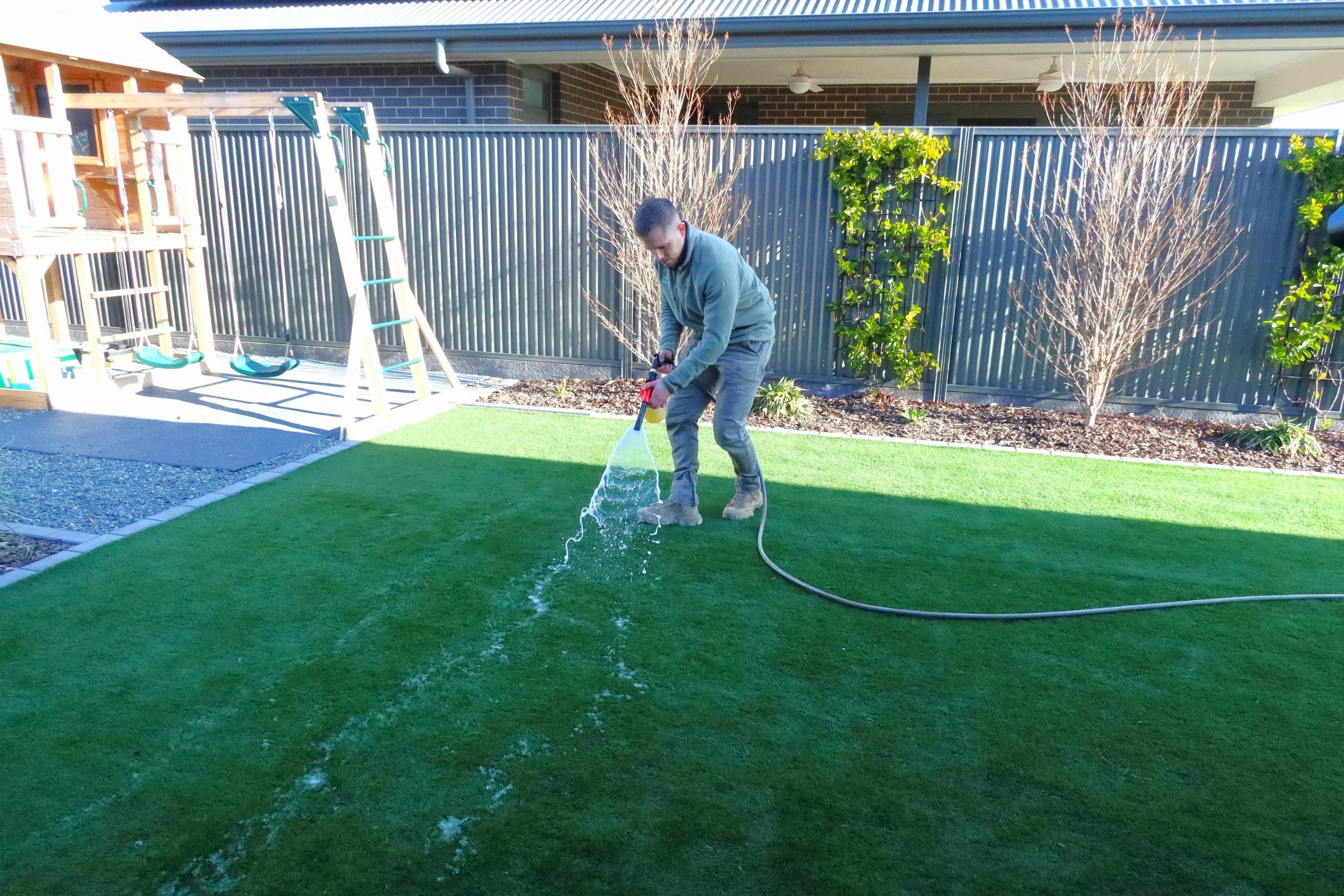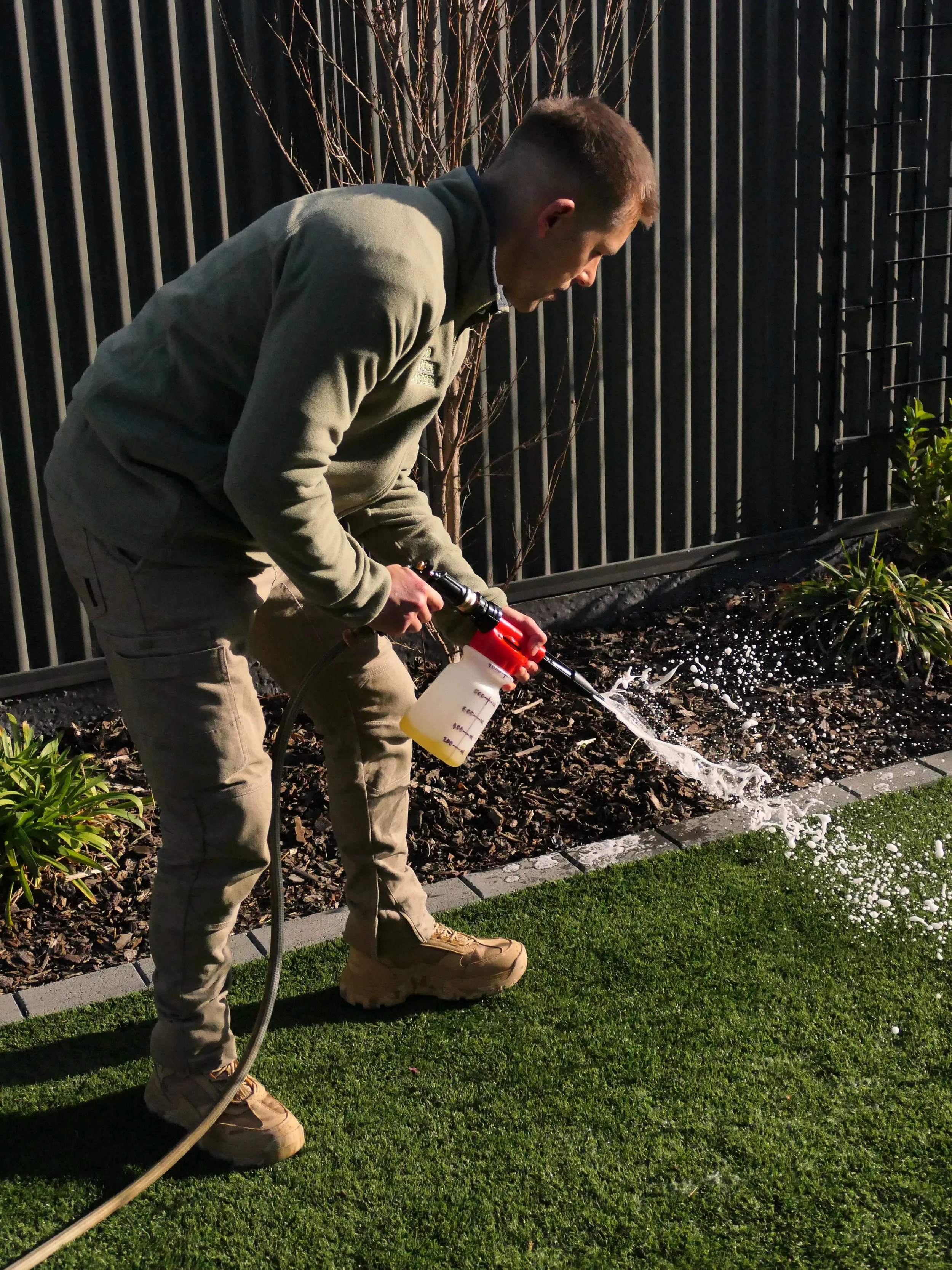 Our field technicians require access to a compatible outdoor water tap within 45 metres of the treatment zone. Using specialised equipment and following prescribed application guidelines, we aim to neutralise harmful microbes and reduce unpleasant odours across artificial surfaces, patios, and high-traffic pet zones. Due to real-world surface variations and environmental factors, results may vary.