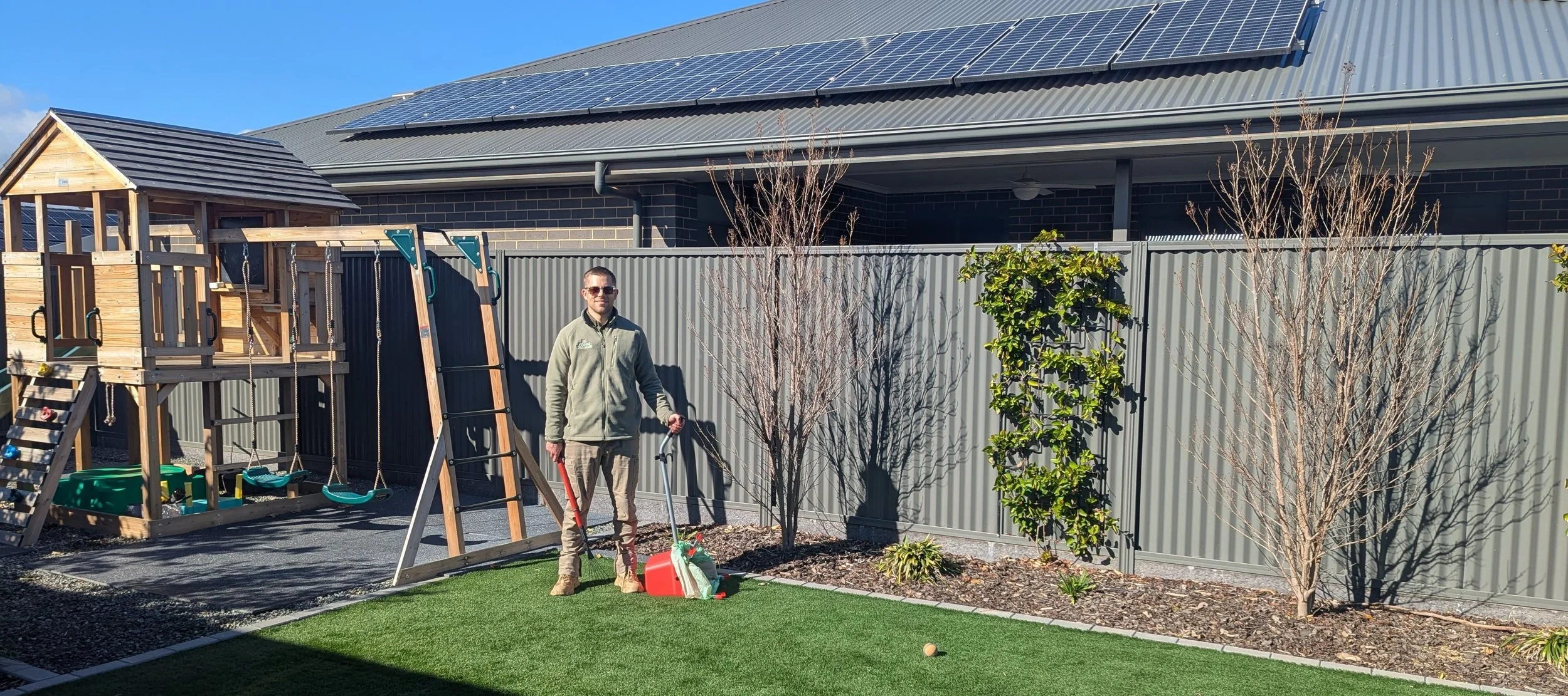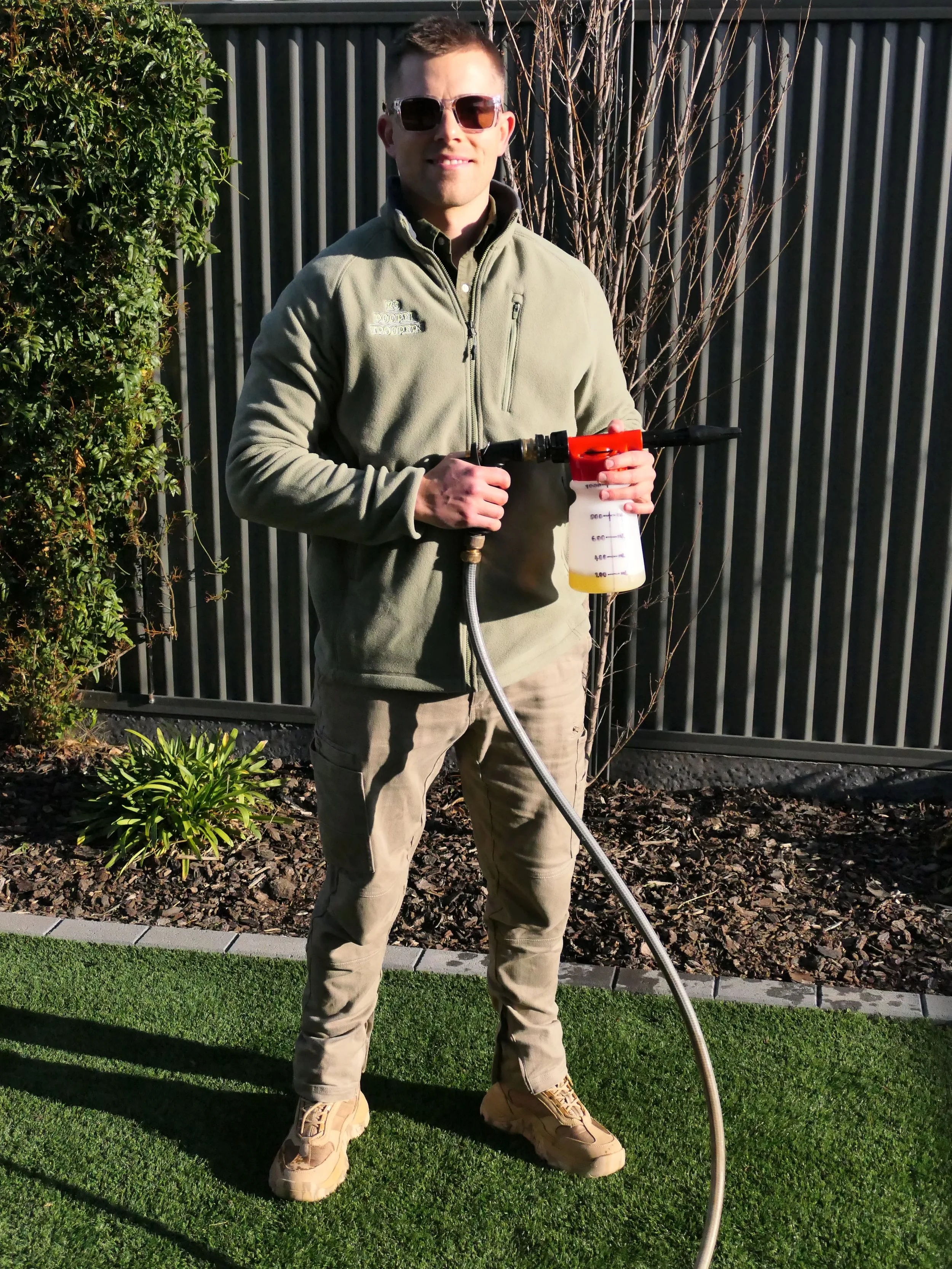 When your outdoor spaces need backup beyond basic scooping, our Sanitising & Deodorising treatment steps in. This service is suitable for artificial surfaces and hardscapes, such as artificial grass, concrete, pavers, decking, or tiles. We deploy XO2® 5 in 1 Commercial Grade Disinfectant & Cleaner in the Lemongrass fragrance—an Australian-made solution that’s declared safe for humans, pets, and surfaces when used as directed. It contains NO phenolics, chlorine, or toxic chemicals. However, plant safety isn’t guaranteed, so care is taken during deployment. XO2 5 in 1 has been tested and proven effective against E. coli and Staphylococcus aureus in controlled lab conditions under TGA standards.